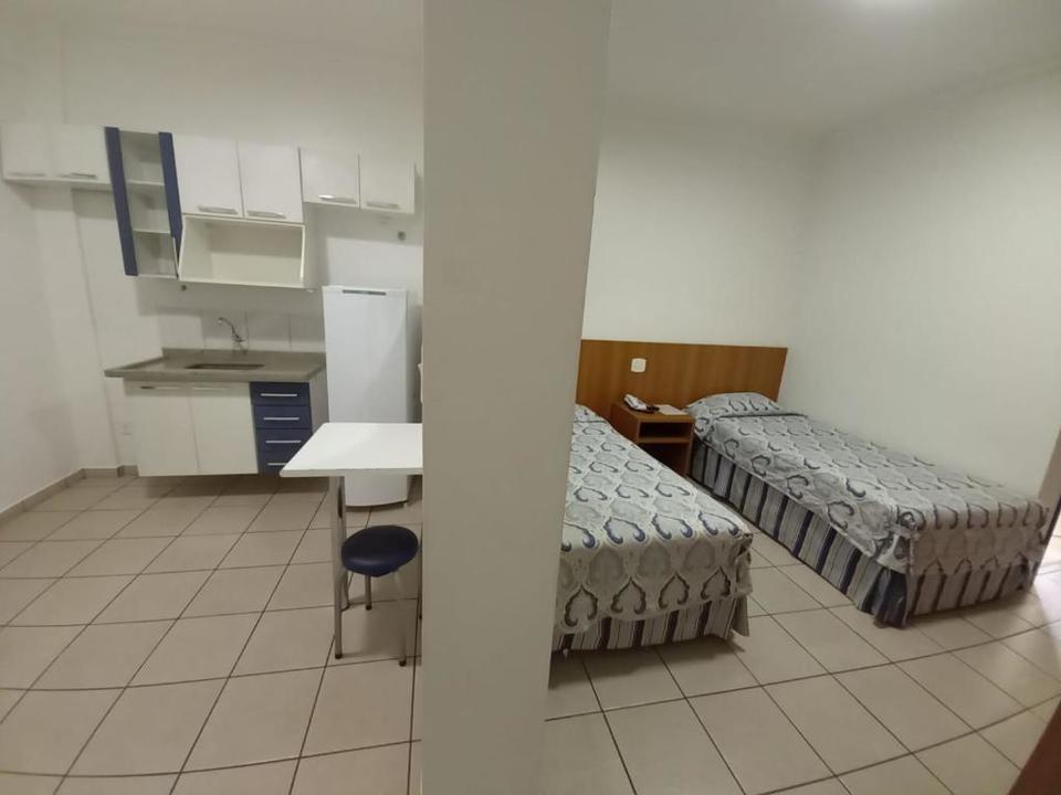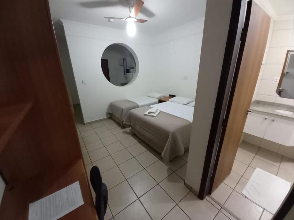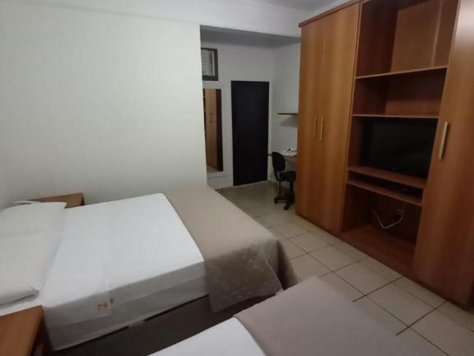 Quarto grande, duas camas de solteiro, tv, geladeira, guarda roupas e ar condicionado.