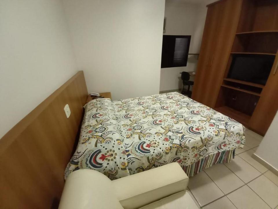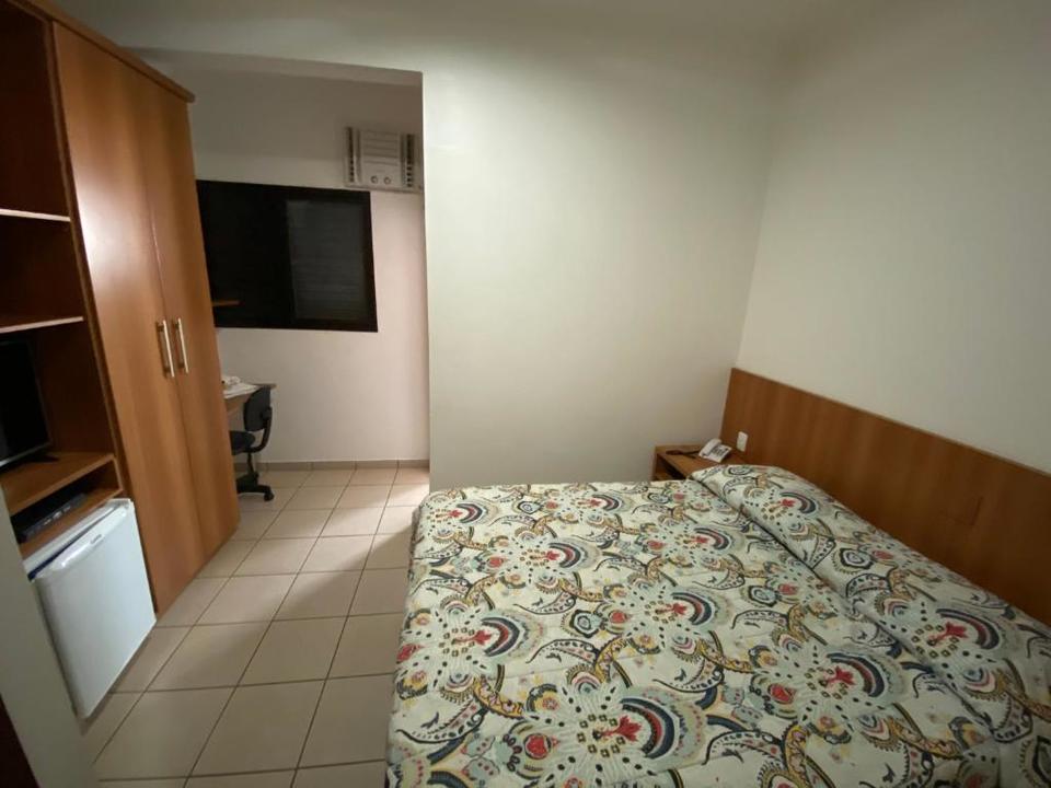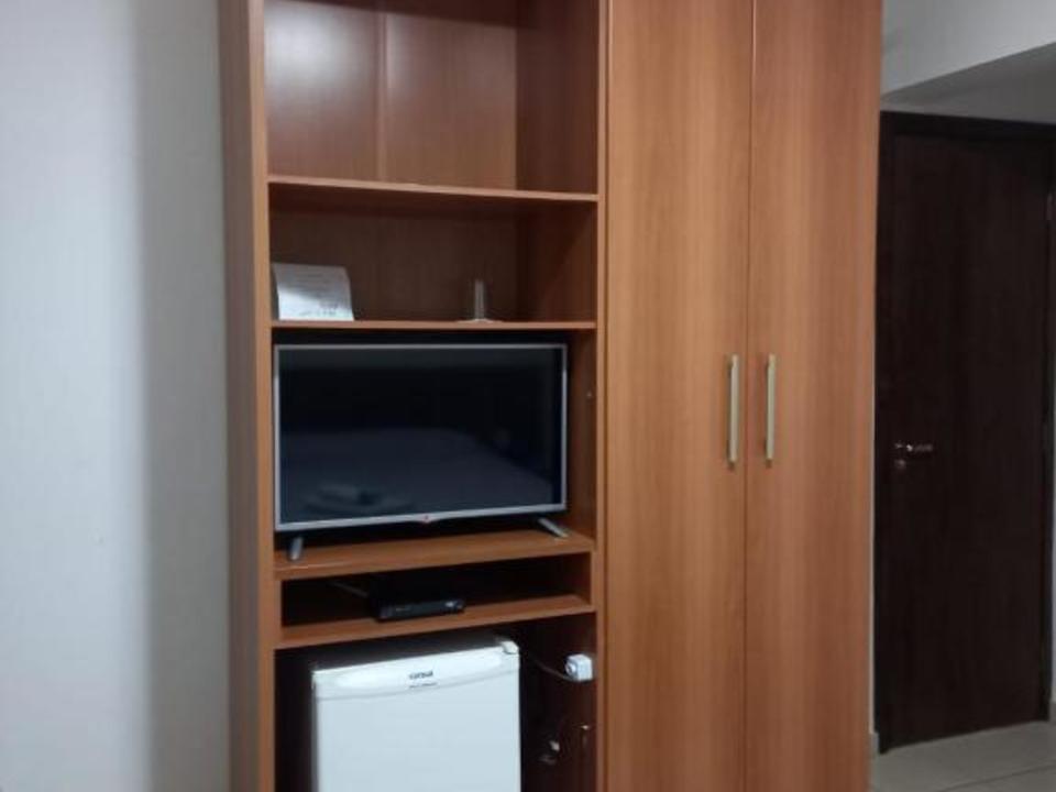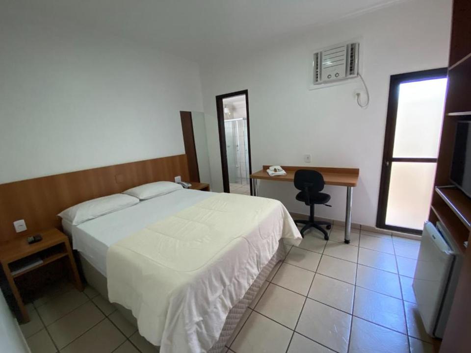Quarto grande, uma cama de casal, tv, geladeira, guarda roupas e ar condicionado.