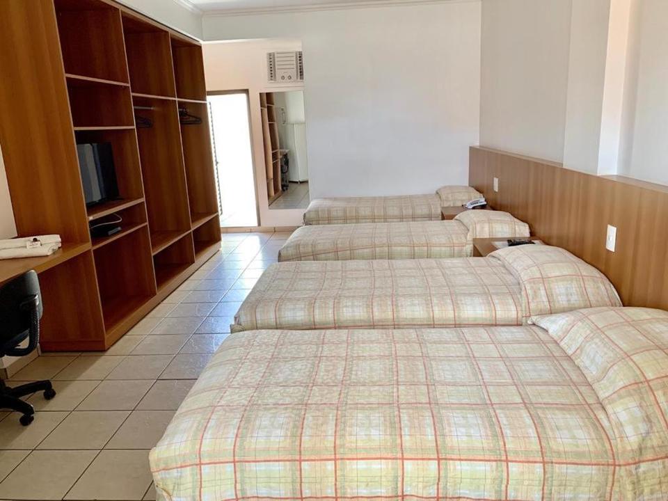 Quarto grande, quatro camas de solteiro, geladeira, guarda roupas e ar condicionado.