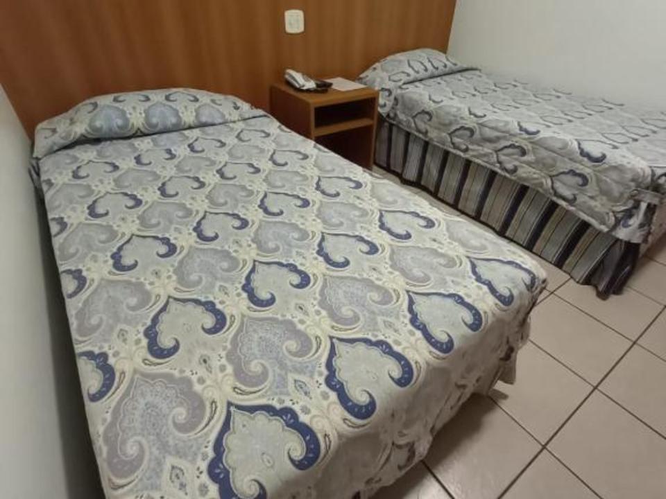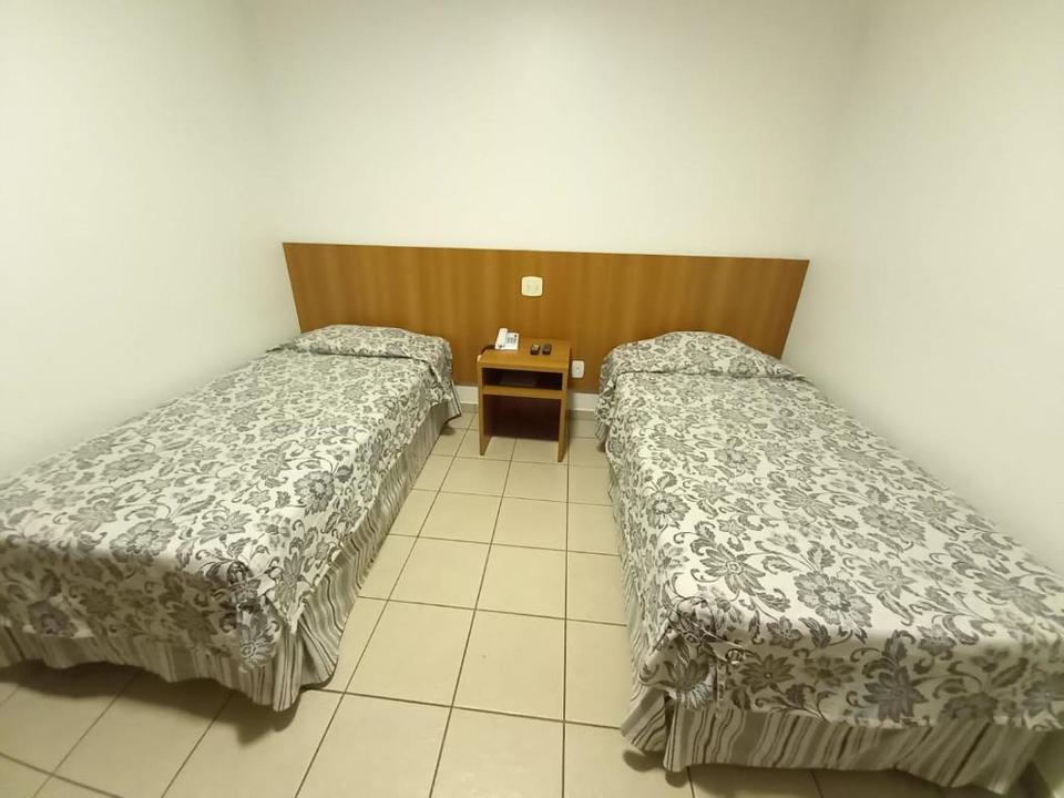 Quarto compacto, duas camas de solteiro, tv, frigobar e ar condicionado.