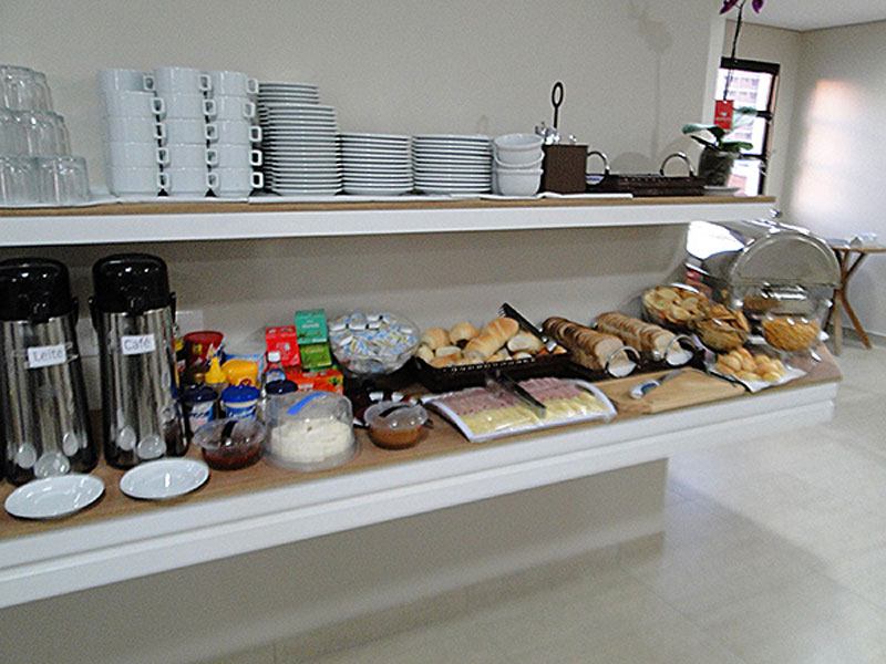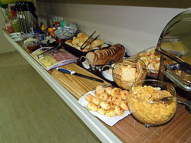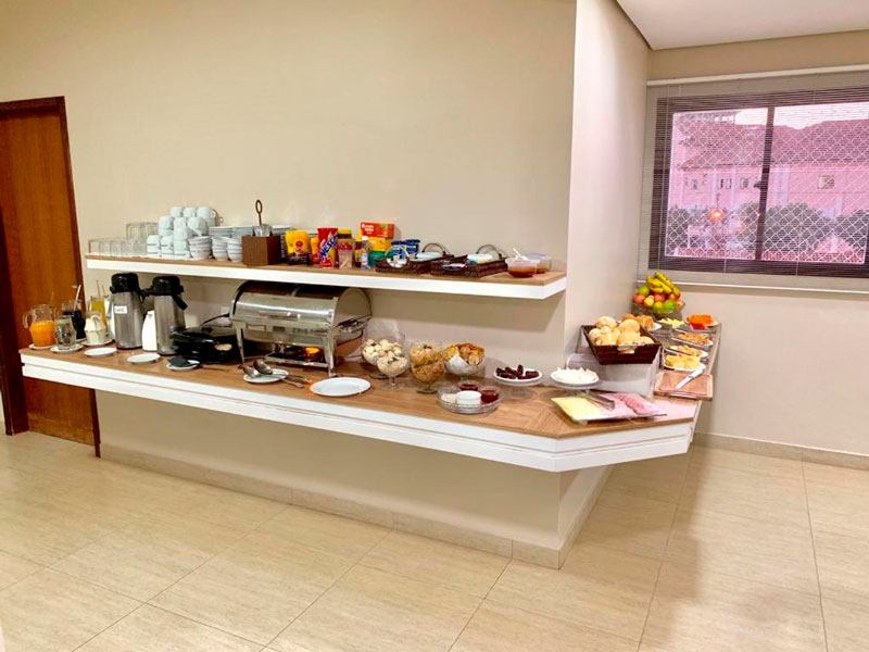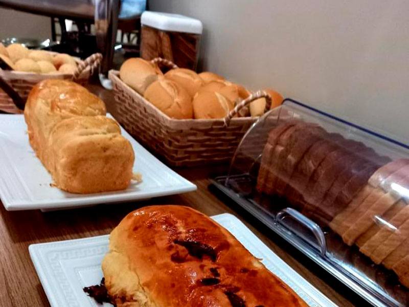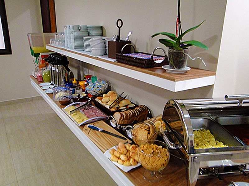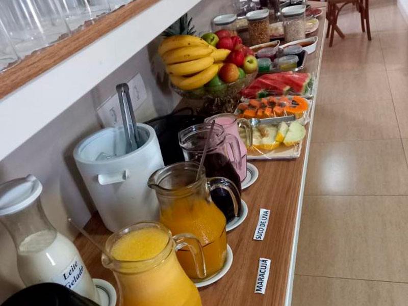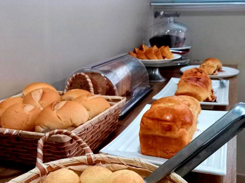 Os hóspedes podem desfrutar de pães variados, bolos caseiros, frutas da estação, frios selecionados, cereais, sucos naturais e bebidas quentes como café e chás. Além disso, há opções quentes como ovos mexidos, salsichas e tapiocas preparadas na hora.
